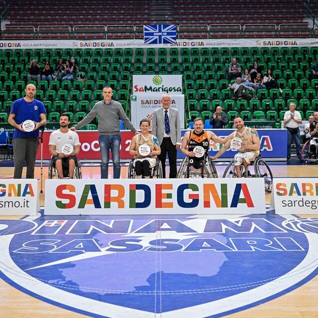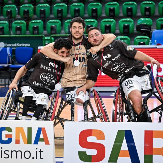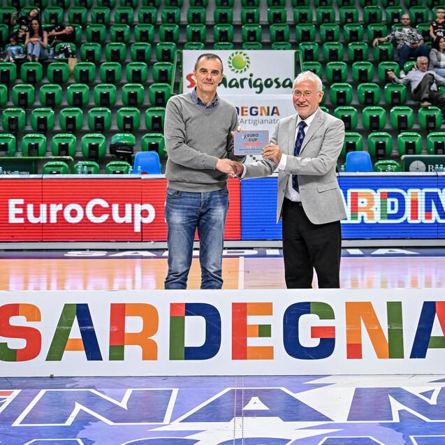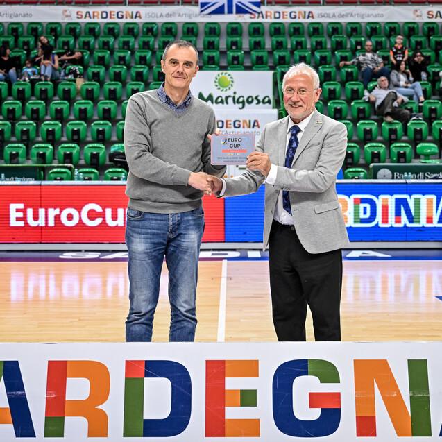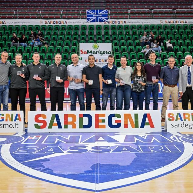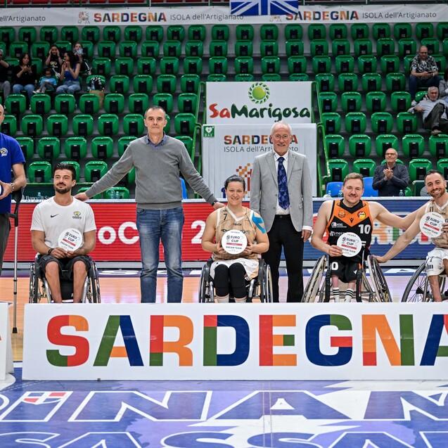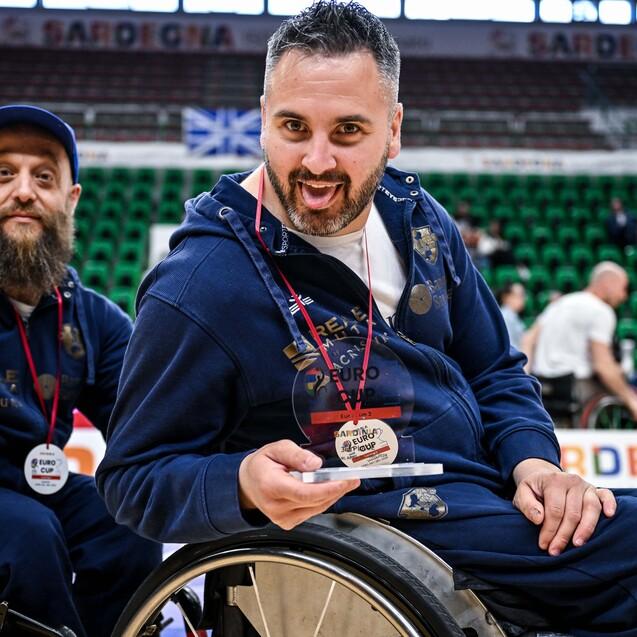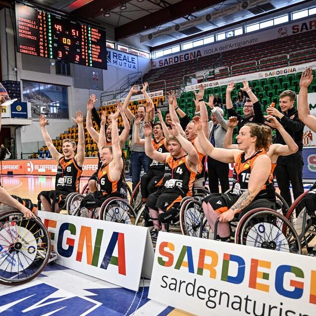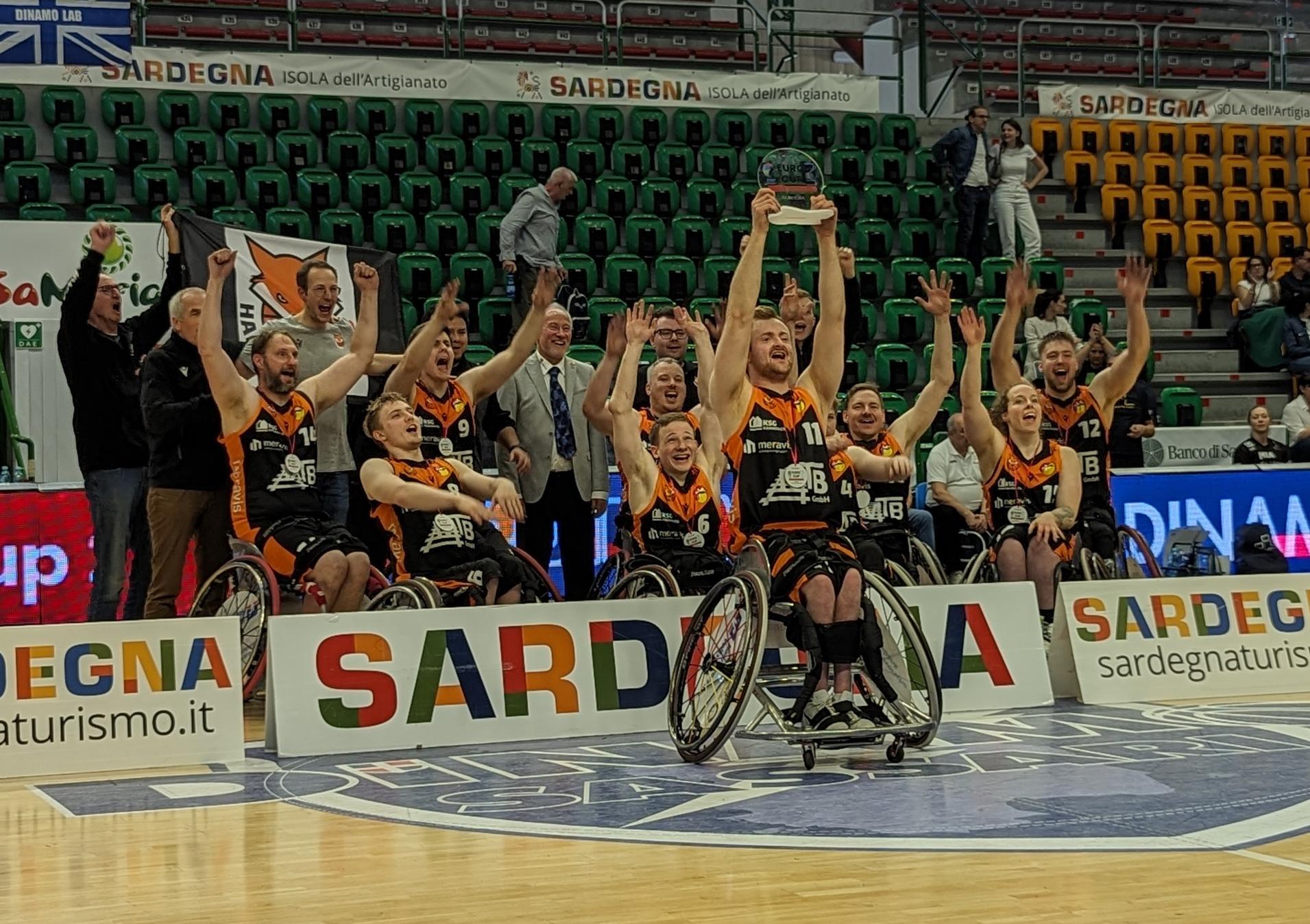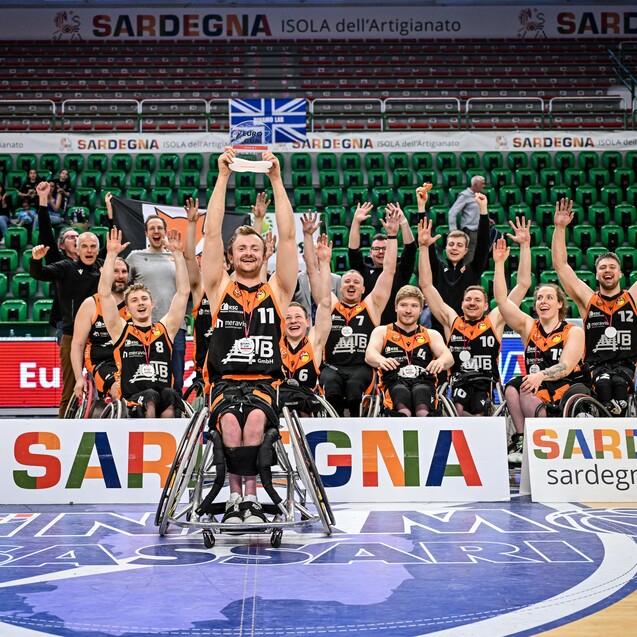 United-Kapitän Jan Sadler (vorn) reckt bei der Siegerehrung zum Gewinn des EuroCup2 die Trophäe in die Höhe. Im Hintergrund jubelt die Mannschaft. Foto: Bonita Patten / Hannover United