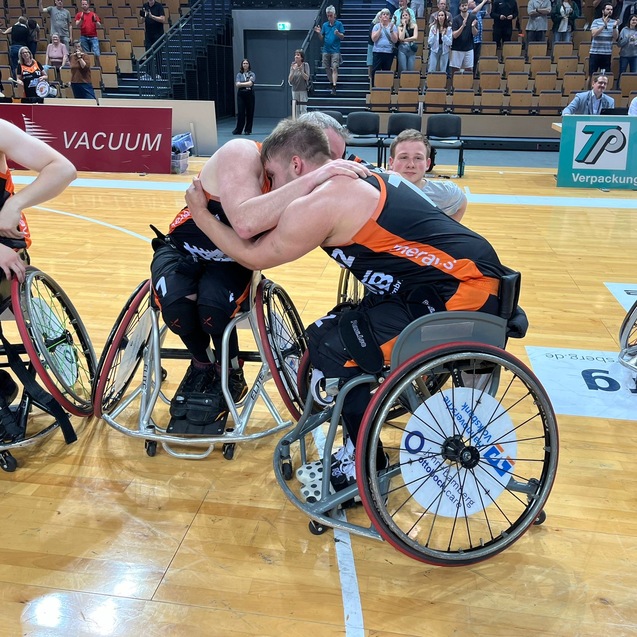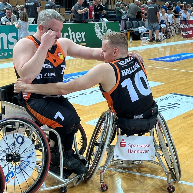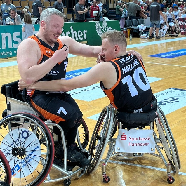 Raus mit Applaus. Die Rollstuhlbasketballer von Hannover United bedanken sich nach Spiel 3 der Halbfinalserie bei ihren Fans für die Unterstützung. Foto: Steffie Wunderl