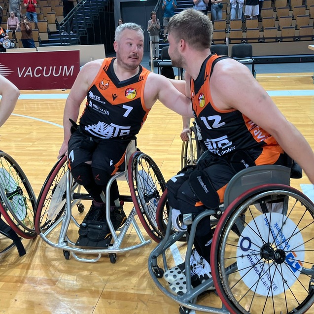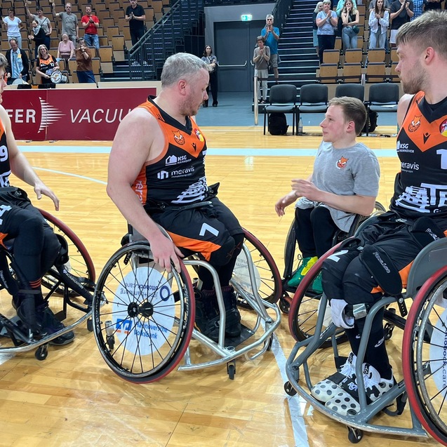 Raus mit Applaus. Die Rollstuhlbasketballer von Hannover United bedanken sich nach Spiel 3 der Halbfinalserie bei ihren Fans für die Unterstützung. Foto: Steffie Wunderl