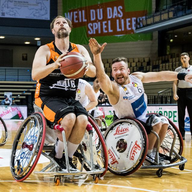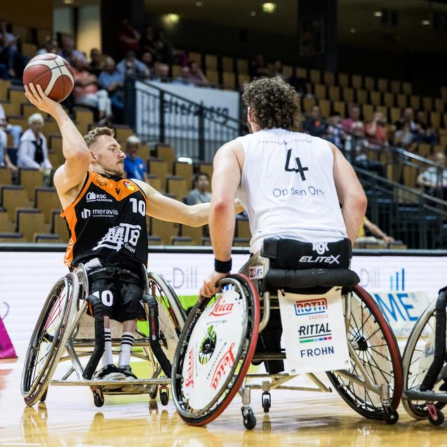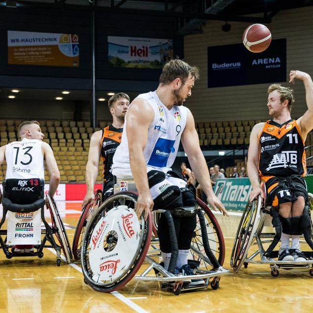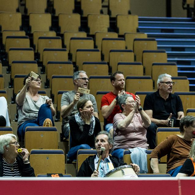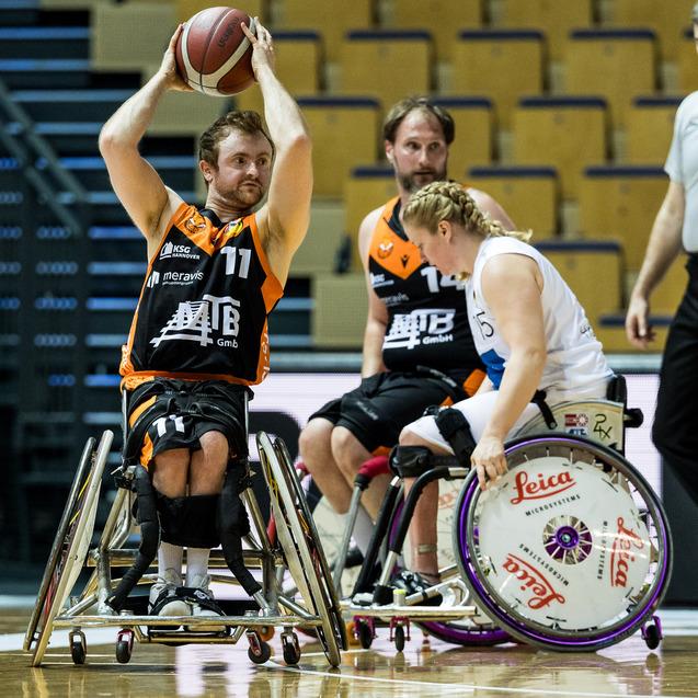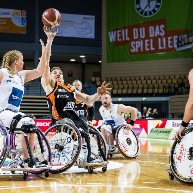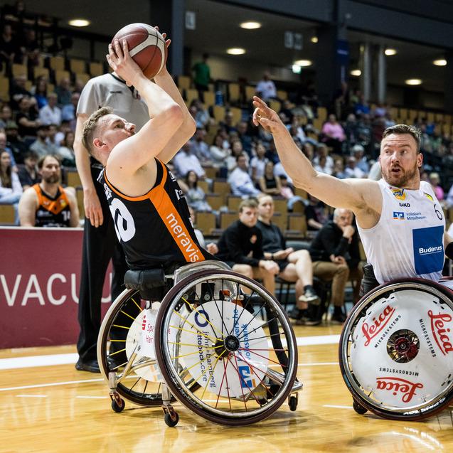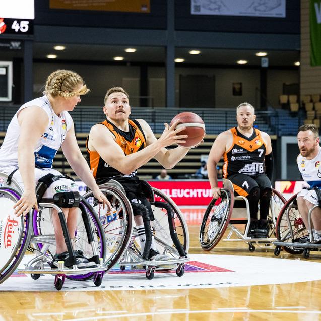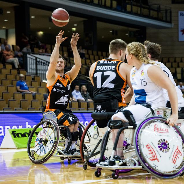 Raus mit Applaus. Die Rollstuhlbasketballer von Hannover United bedanken sich nach Spiel 3 der Halbfinalserie bei ihren Fans für die Unterstützung. Foto: Steffie Wunderl