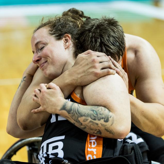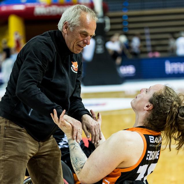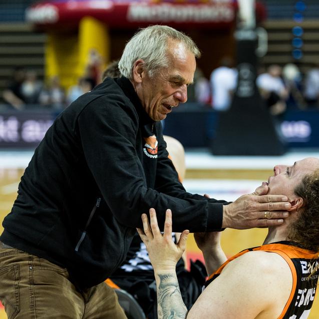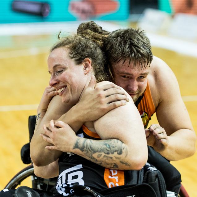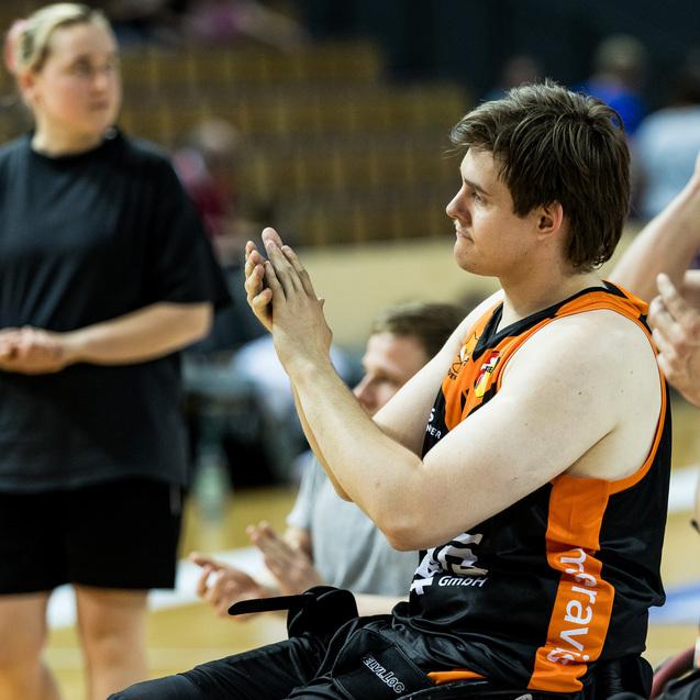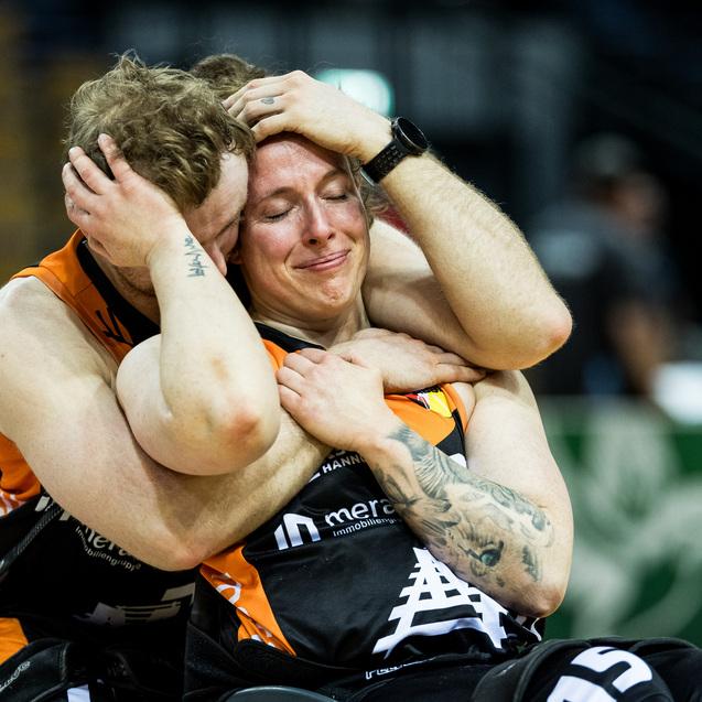Raus mit Applaus. Die Rollstuhlbasketballer von Hannover United bedanken sich nach Spiel 3 der Halbfinalserie bei ihren Fans für die Unterstützung. Foto: Steffie Wunderl